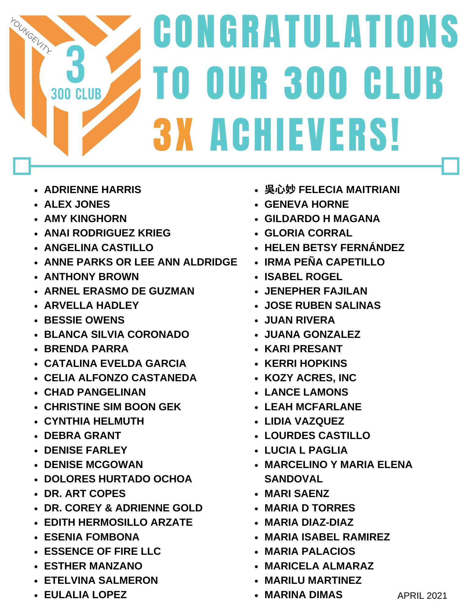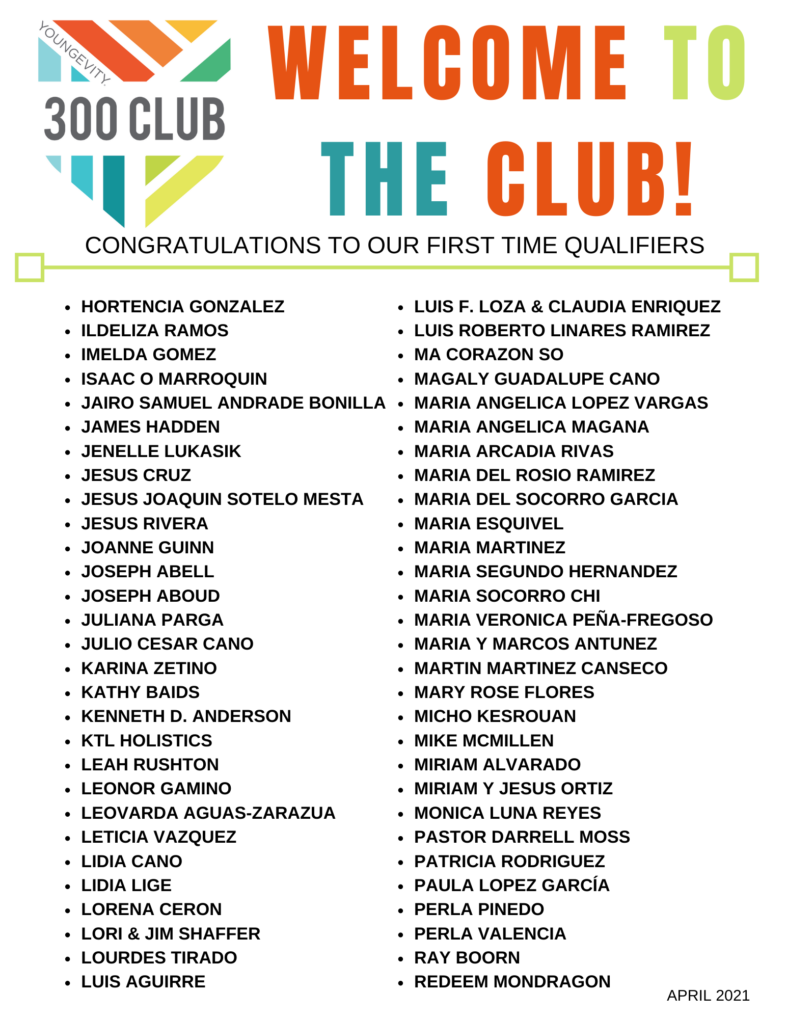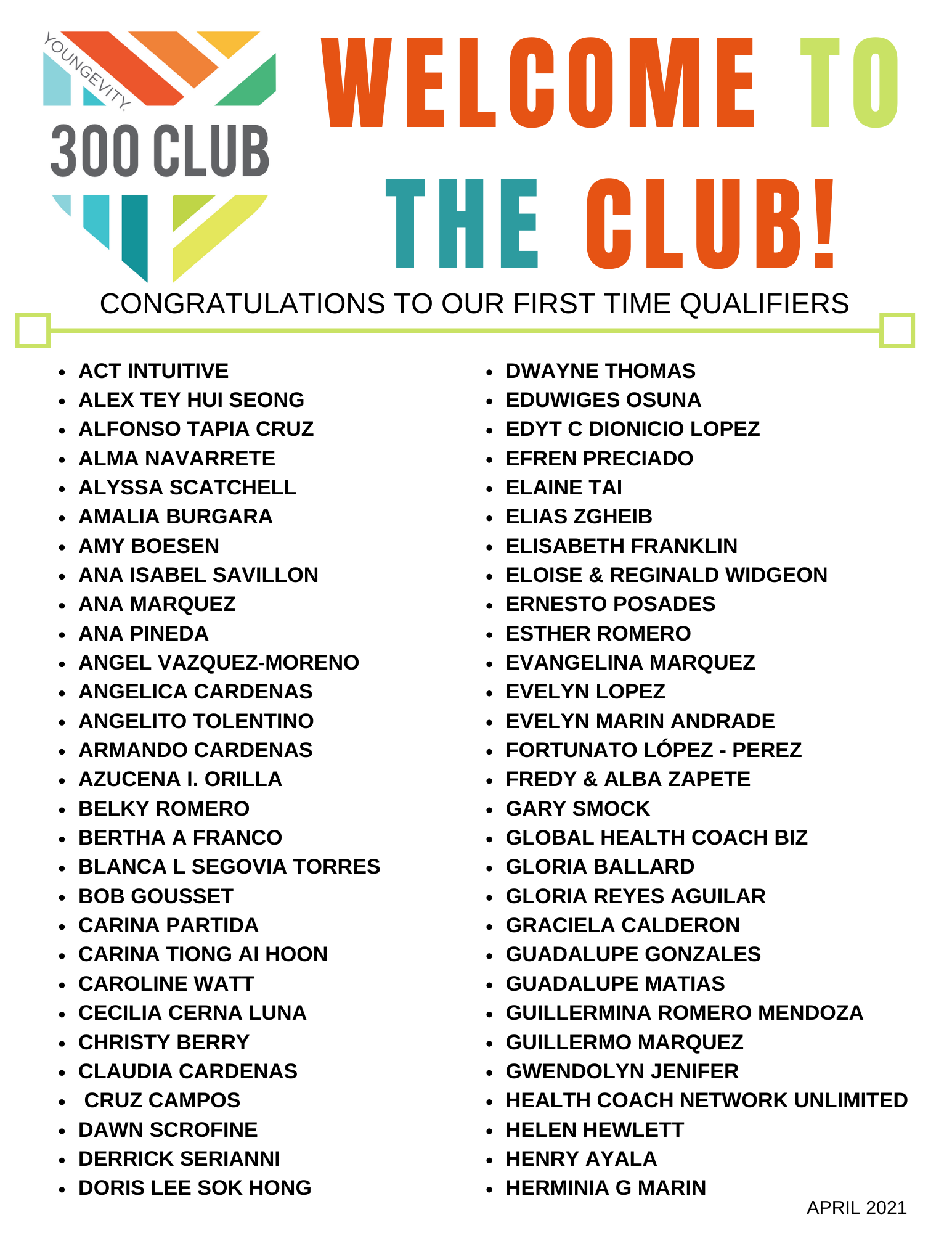 Congratulations to everyone that qualified for the 300 Club in April! Qualifying for this club each month shows that you are consistently working to grow your Youngevity business. No matter where you are in your business, it’s never to late to join the 300 Club!