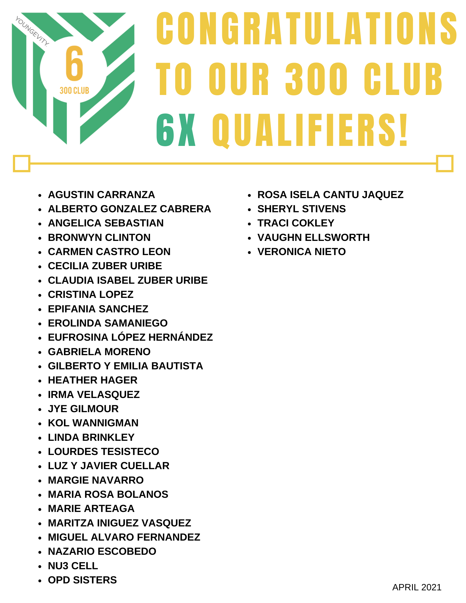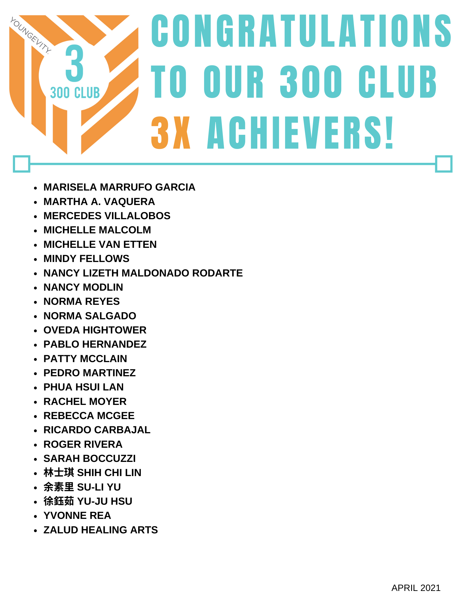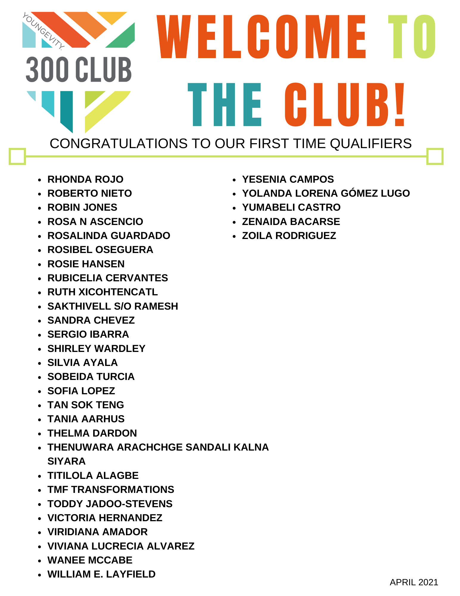 Congratulations to everyone that qualified for the 300 Club in April! Qualifying for this club each month shows that you are consistently working to grow your Youngevity business. No matter where you are in your business, it’s never to late to join the 300 Club!