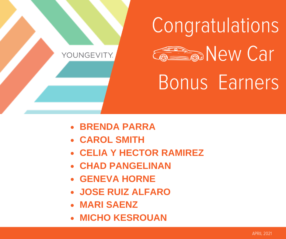 Let Youngevity make your car payment! Congratulations to the following individuals that earned Youngevity’s generous car bonus for the first time this past month.