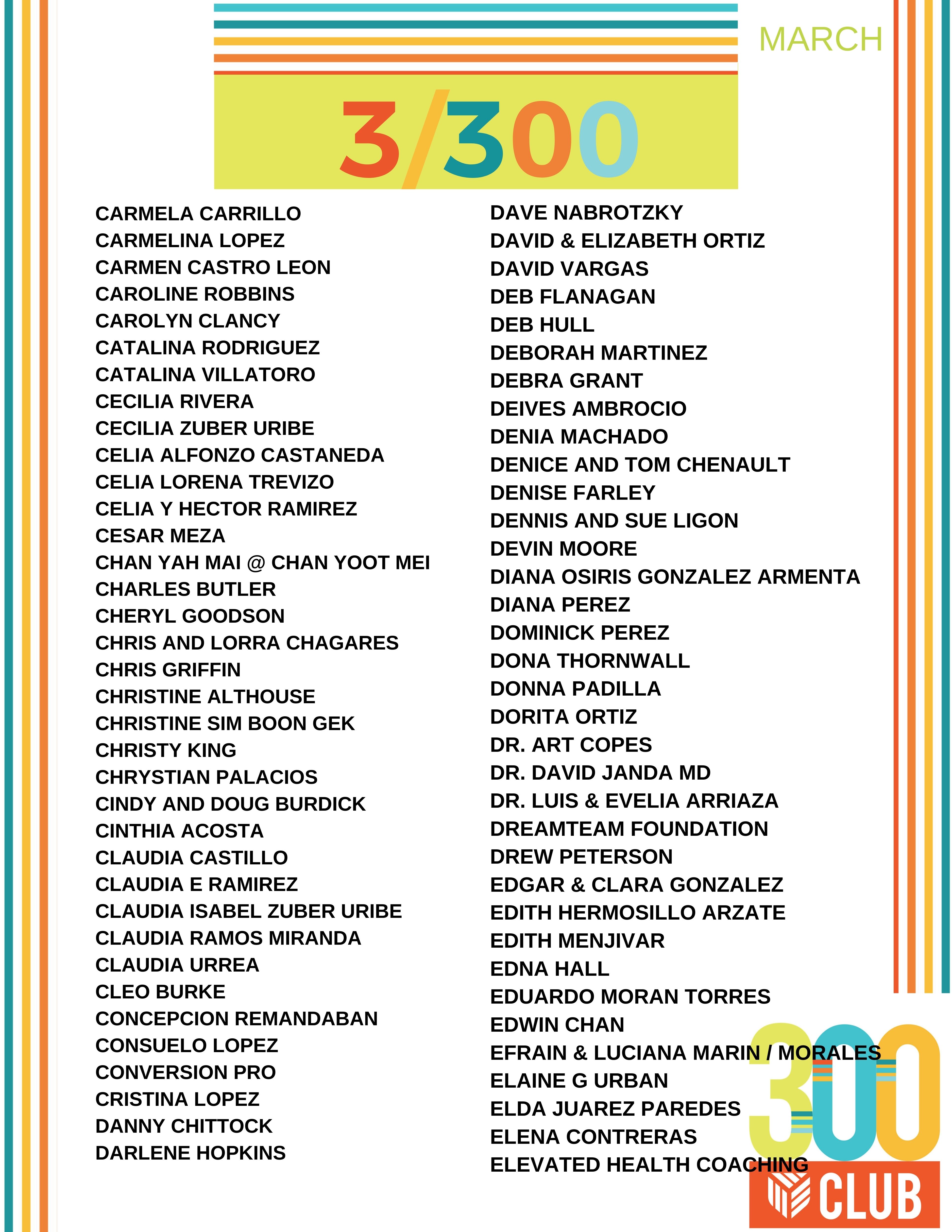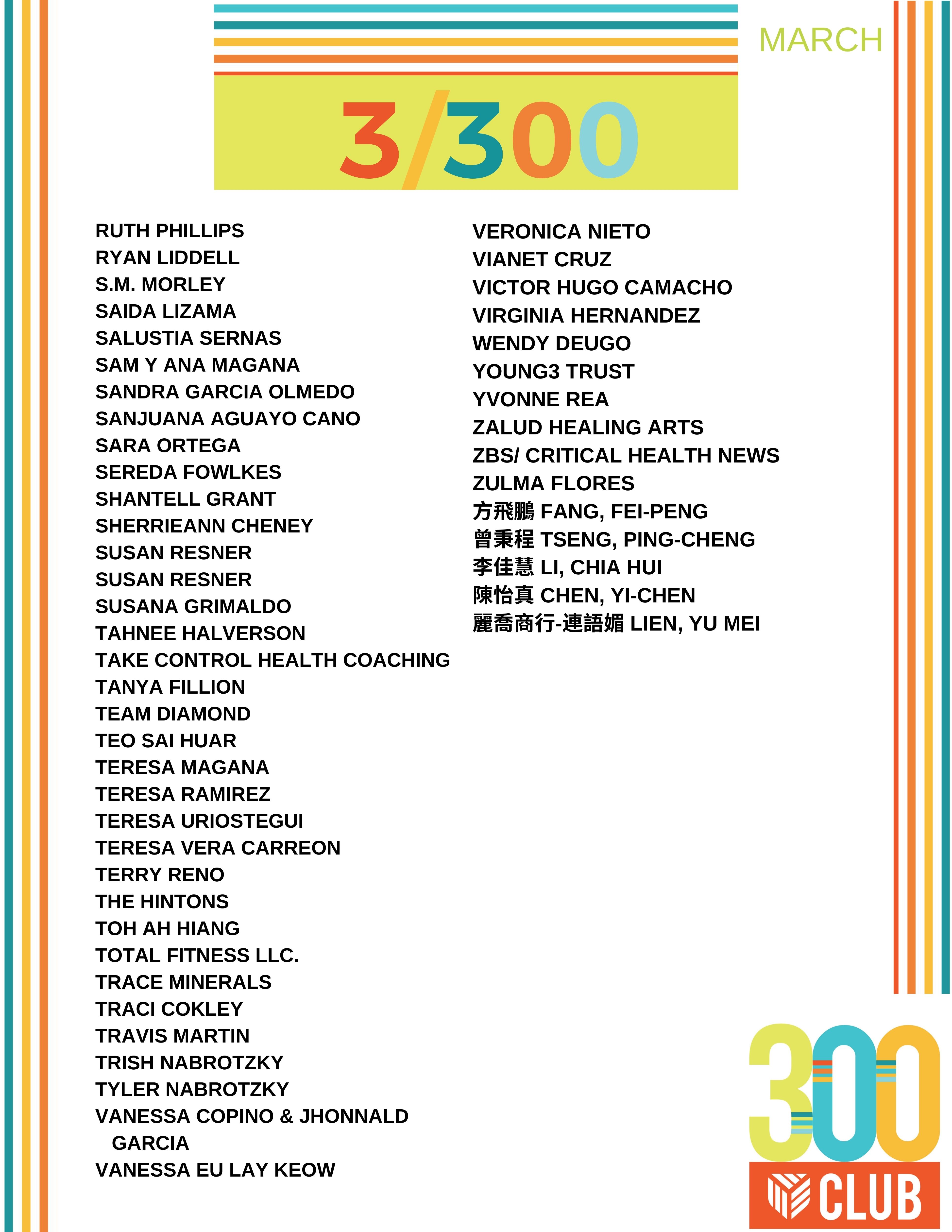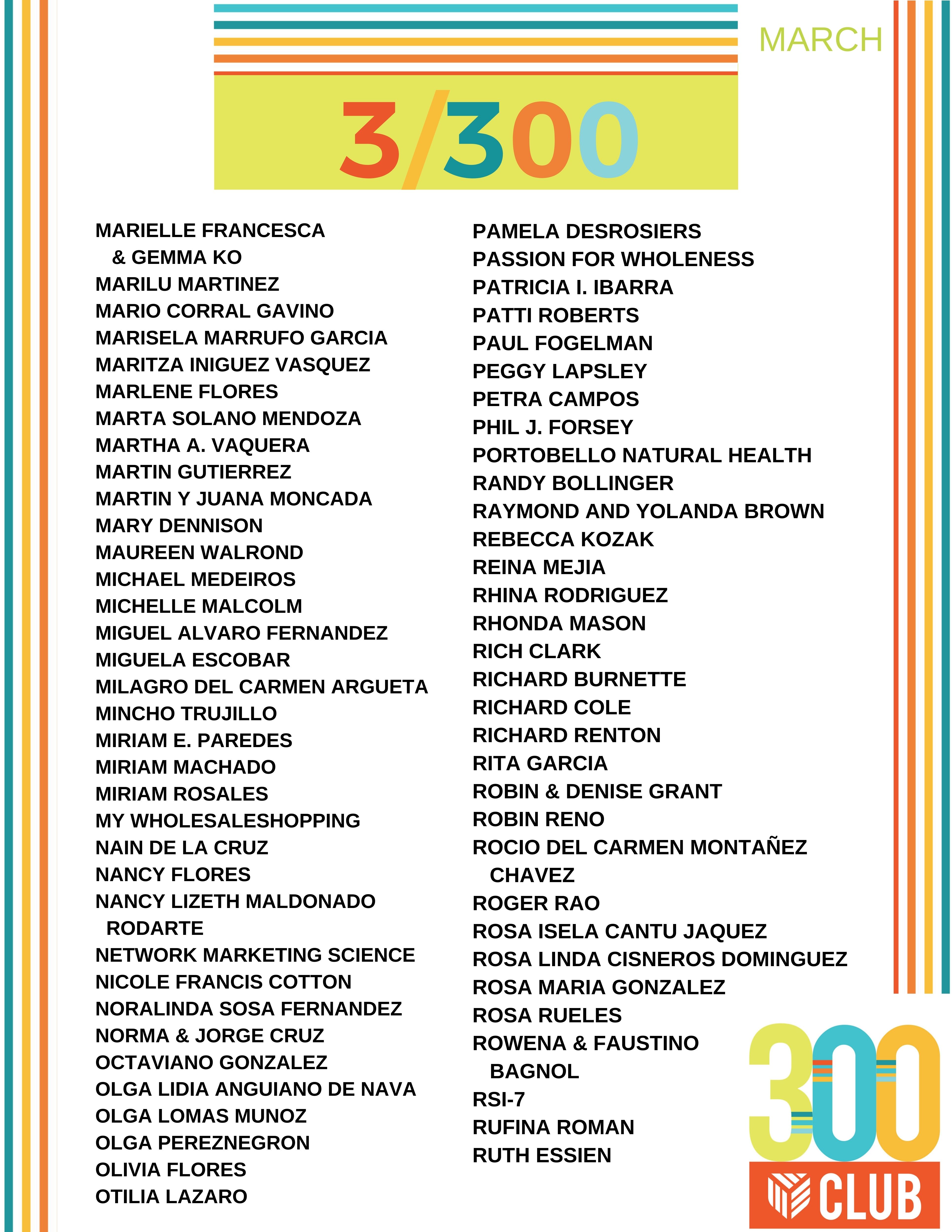 Congratulations to everyone that qualified for the 300 Club in March! Qualifying for this club each month shows that you are consistently working to grow your Youngevity business. No matter where you are in your business, it’s never to late to join the 300 Club!