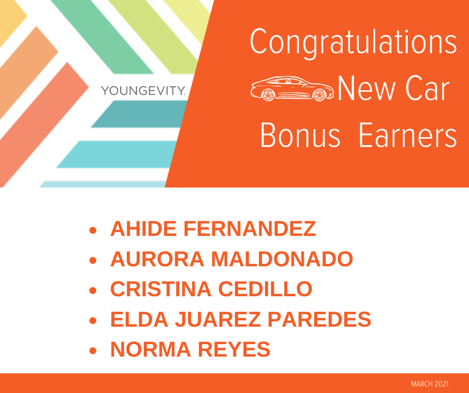 Let Youngevity make your car payment! Congratulations to the following individuals that earned Youngevity’s generous car bonus for the first time this past month.