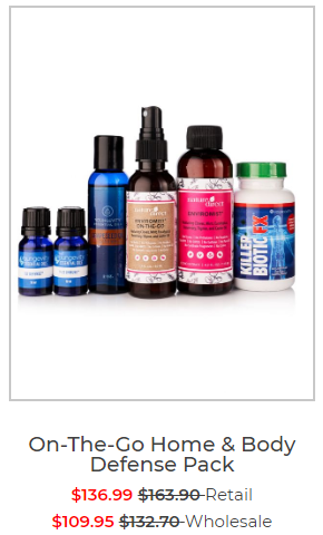 - On-the-Go Home & Body Defense Pack: This pack is perfect for those that want to disinfect their surroundings on the go as well as deodorize and sanitize any environment. Included are EnviroMist®, Killer Biotic Fx®, and two Essential Oils – Y-23 Immune™ and 1st Defense. These products all have specific uses that combine to create a healthier environment at home, in the office, or on-the-go.