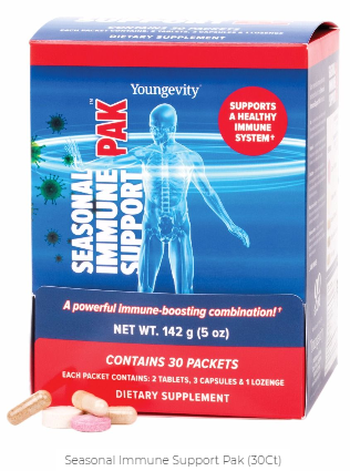 The Seasonal Immune Support Pak contains powerful nutrients known to support a healthy immune system. During periods when viruses and bacteria are easily transmittable, giving your immune system some extra nutritional support can help your body maintain optimal health. This Pak contains Youngevity best-selling immune-supporting products plus, a new, powerful Vitamin C tablet to boost immune health.* The Seasonal Immune Support Pak includes 30 packets, each containing: Zinc Fx (1 lozenge), Immu-911 (1 capsule), Vitamin C (1 tablet), C-Fx (1 capsule) and Killer Biotic FX (1 capsule).
