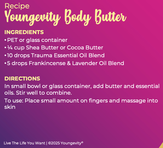 September 11th, 2025 Recovery Be patient with yourself and take time to rejuvenate. Recipes include: Balanced Roll On Peaceful Massage Rejuvenate Through Diffusing September Aroma Share Flyer ...view more >Healthy & Fun Recipes to Spice Up Your Autumn, Youngevity Style